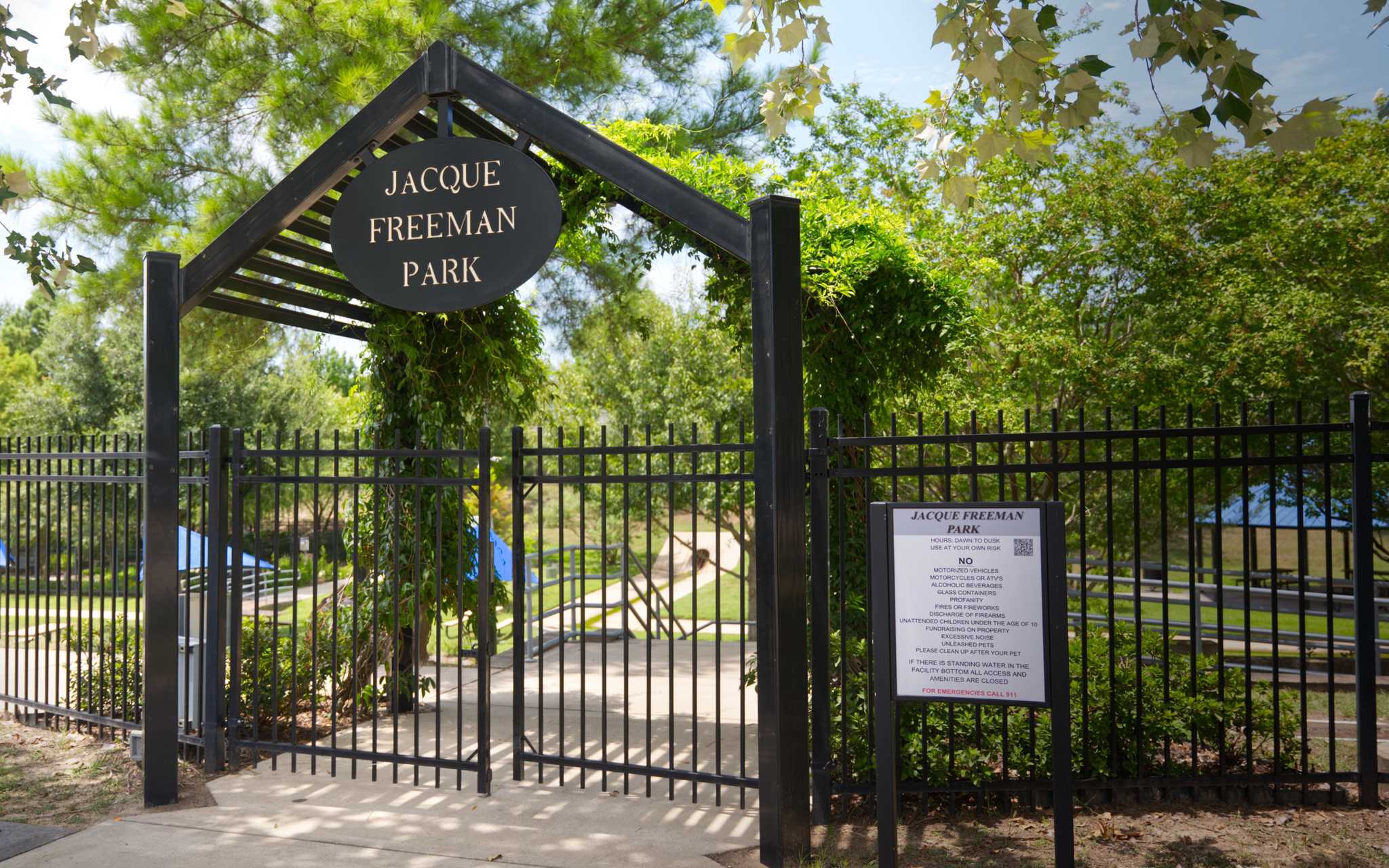 Jacque Freeman Park was conceived by the Ricewood Municipal Utility District Board of Directors in 2011. The board was looking for a means of getting the most use out of the detention pond next to McRoberts Elementary. Posey presented the idea of creating a park that would take the requirements of special needs children into its design.